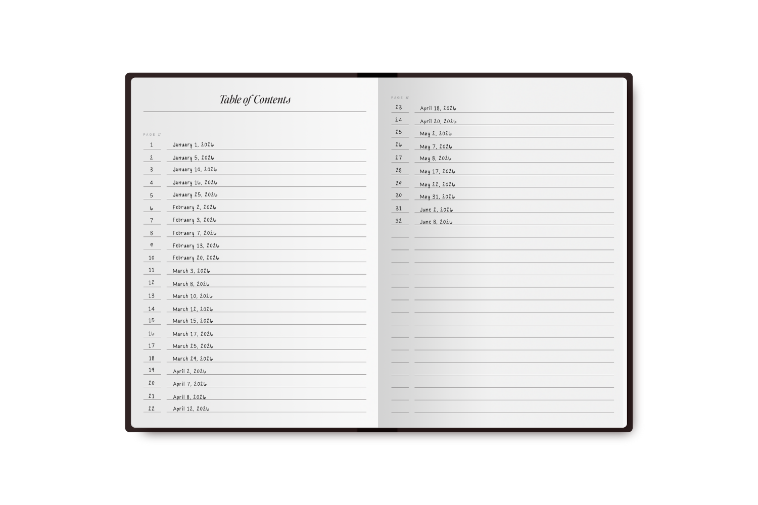 We truly thought of it all. Not only is the journal insanely cute, it also includes features you won’t find in other journals. The front page lets you highlight the time frame this journal covers. From there, it flows into a table of contents (yes!!! when I tell you we tried to think of everything, we really DID!).
