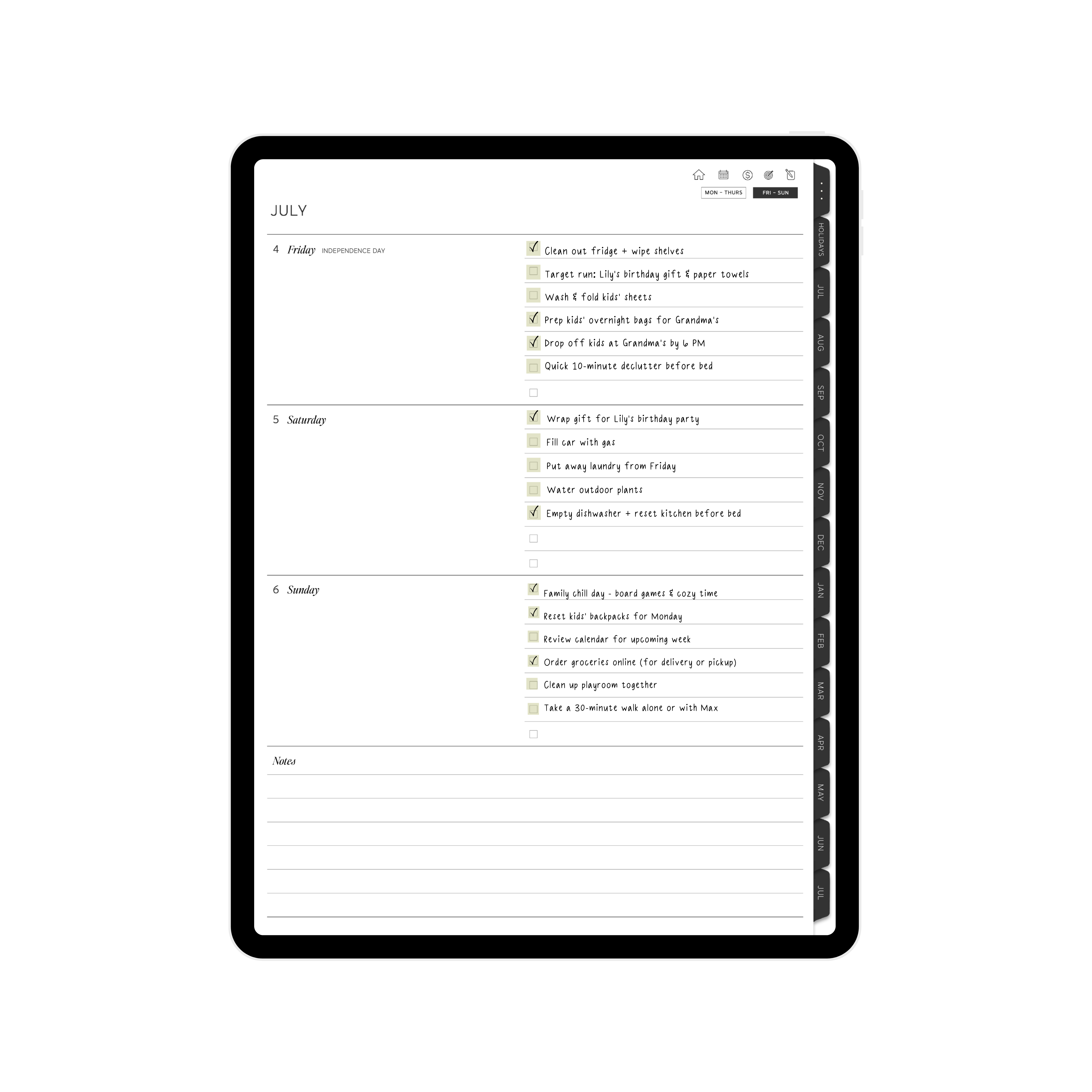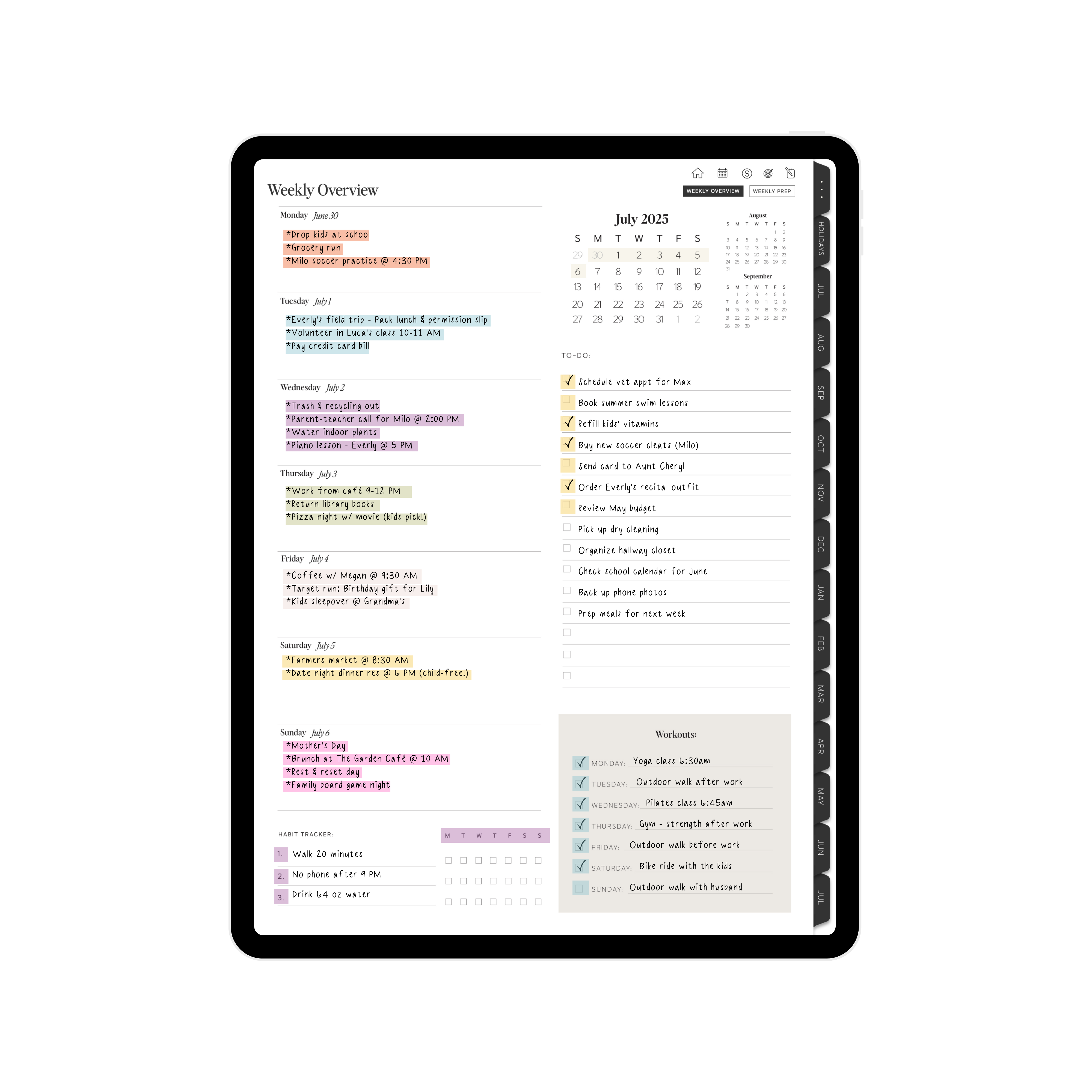 The 2025-2026 Weekly Digital Planner for Moms Bundle has everything you need to plan with grace and simplicity: convenient weekly overview layouts, meal planning, family budgeting and finance tracking, holiday prep, school information sections, packing lists, and more.