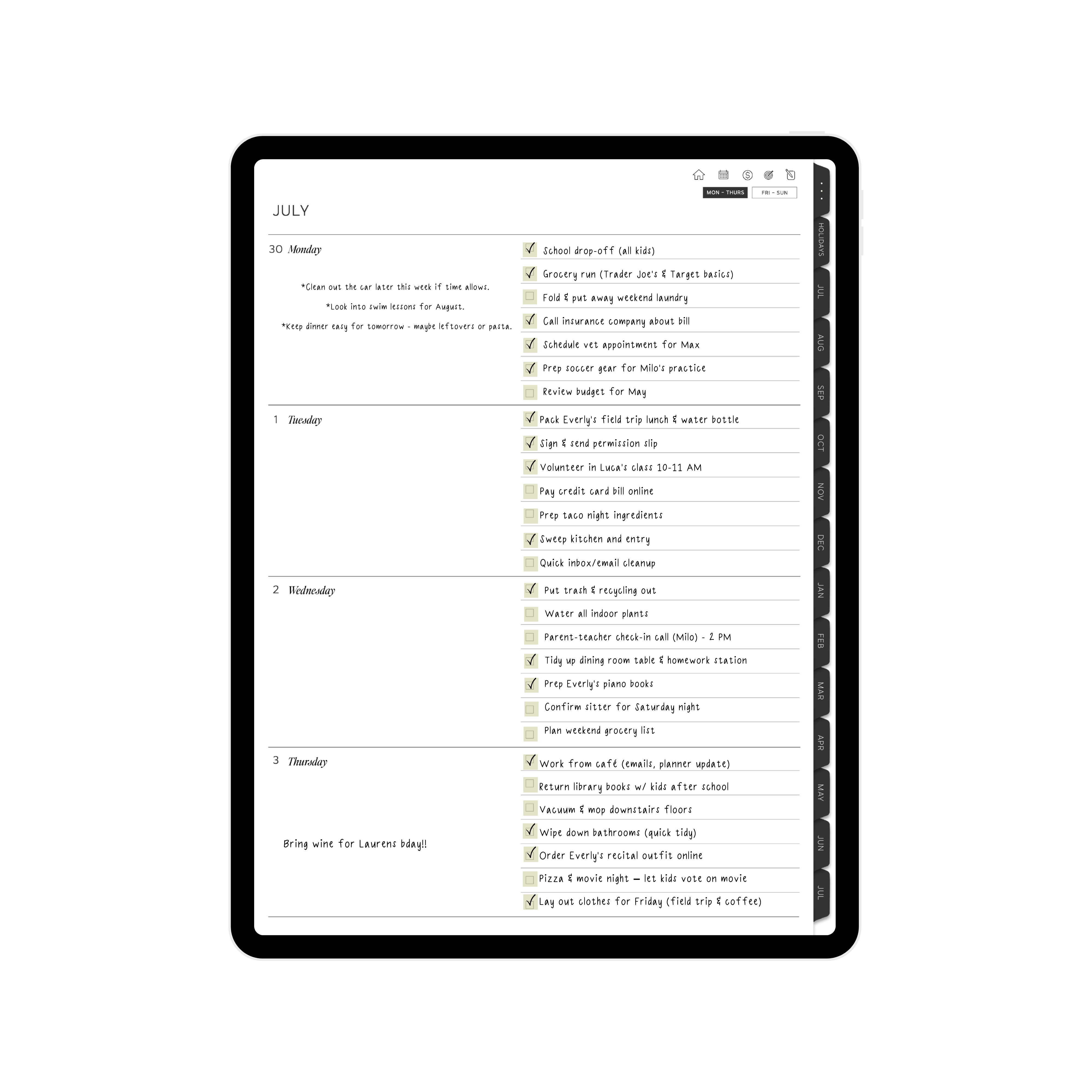 All the parenting tools and organization pages you love from the Mom Planner, but with a simpler weekly layout. No daily pages or time-blocking – just a clear view of your whole week in one place.