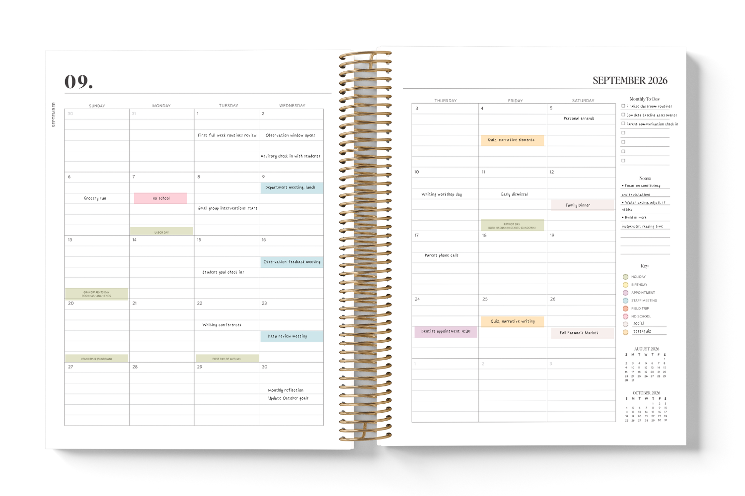 Minimalist weekly planning spreads to see all big to-dos and schedule events at a glance. No daily/hourly time-blocking. Does NOT include teacher-specific pages.