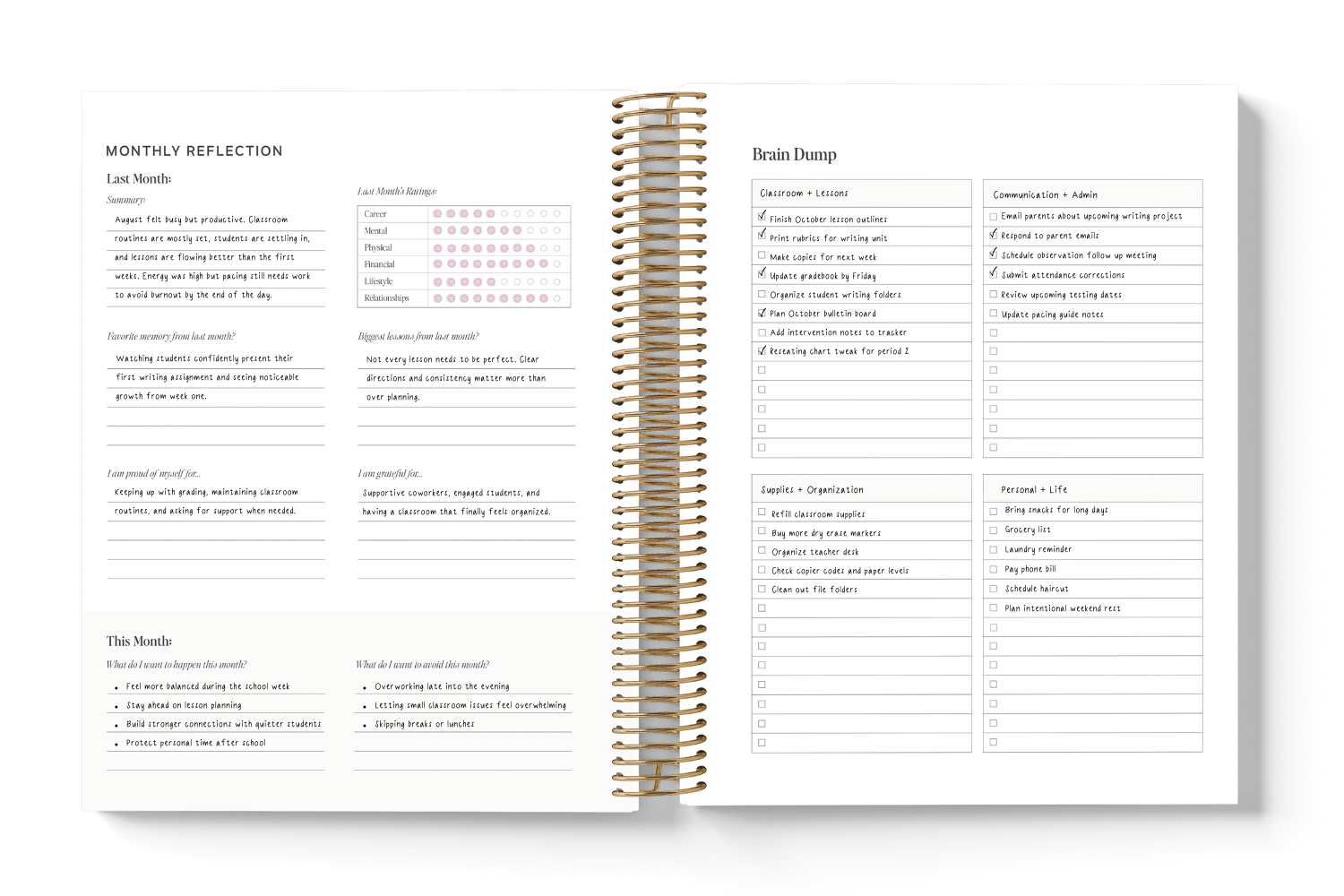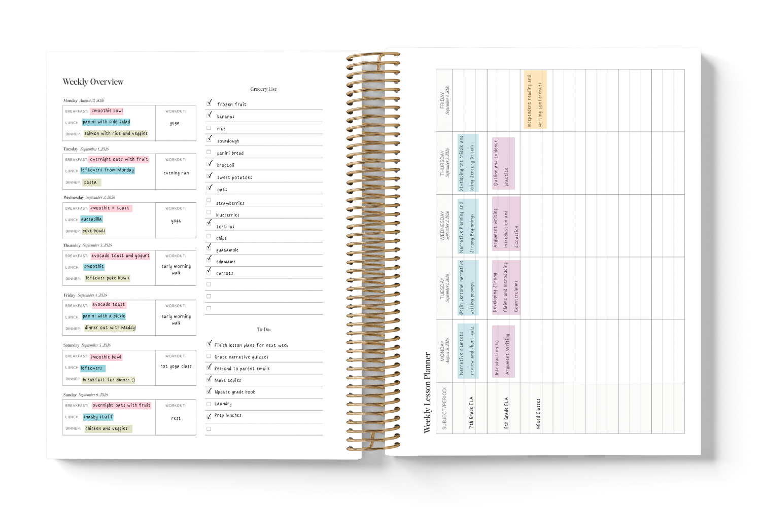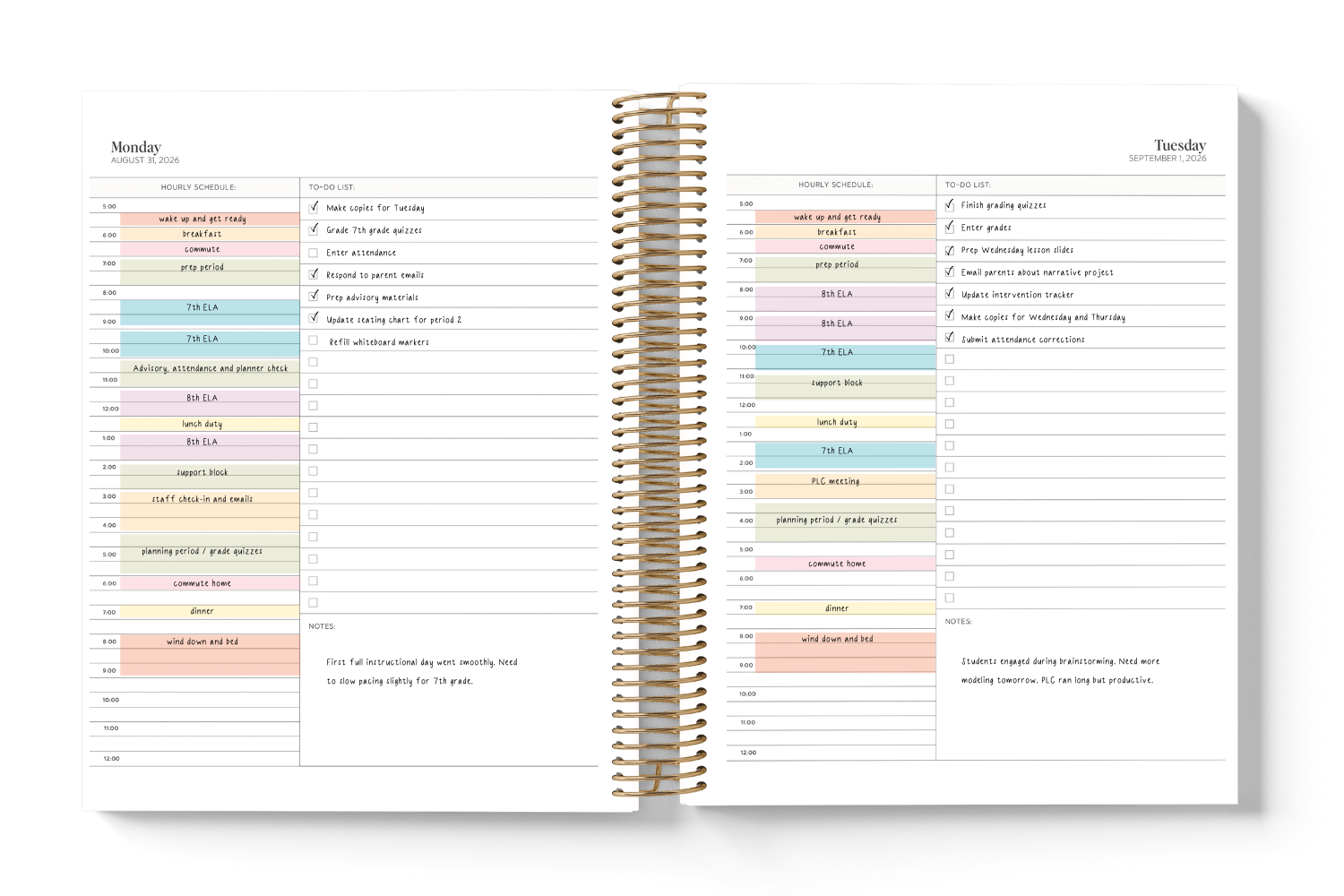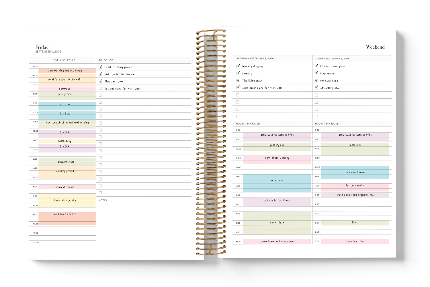 Daily planning pages with hourly time-blocking. Education organization pages like weekly lesson planners, personal vs. classroom yearly to-dos, and more.