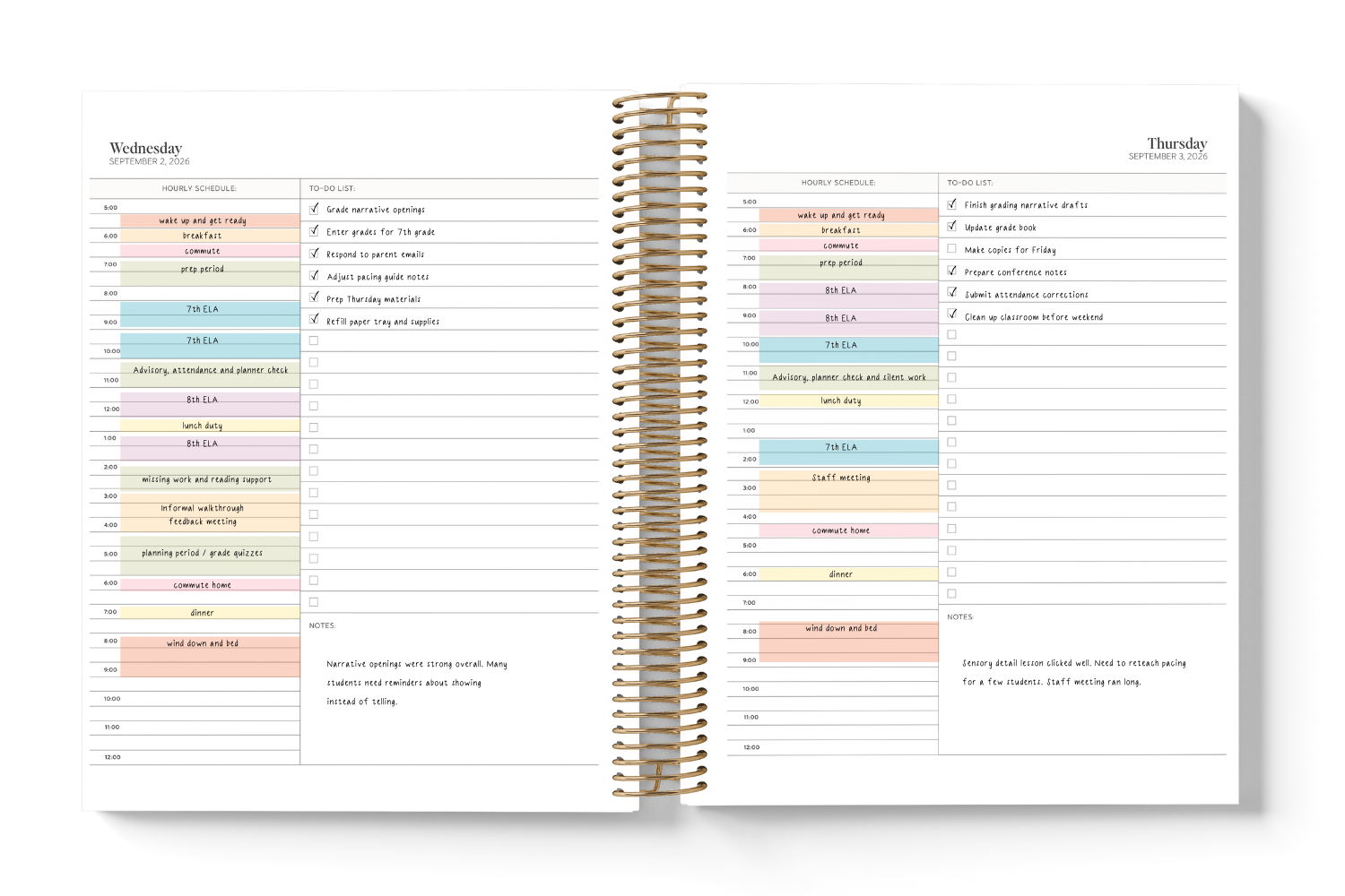 Hourly time-blocking and extended room for to-dos, with individual pages for every day of the week. Does NOT include teacher-specific pages.