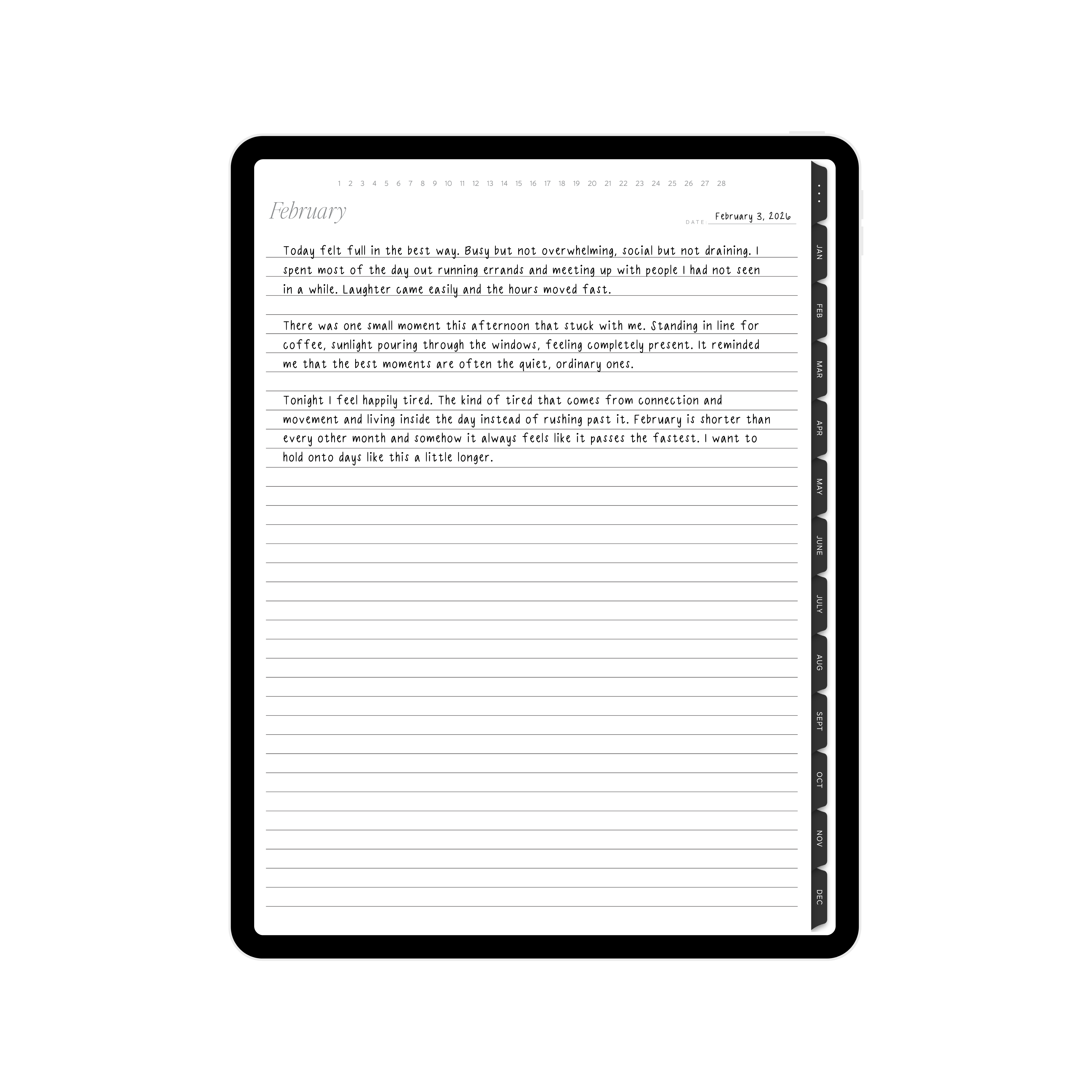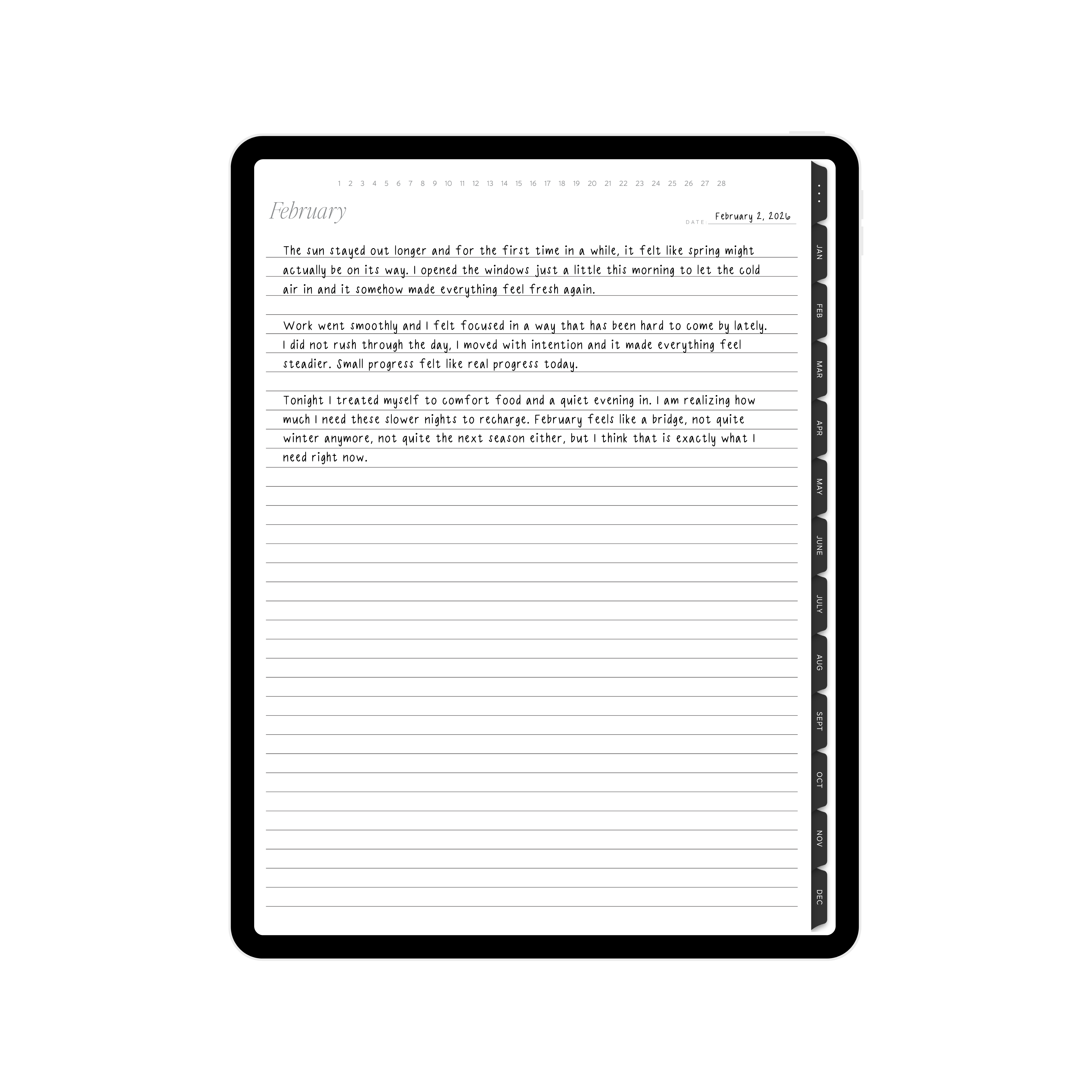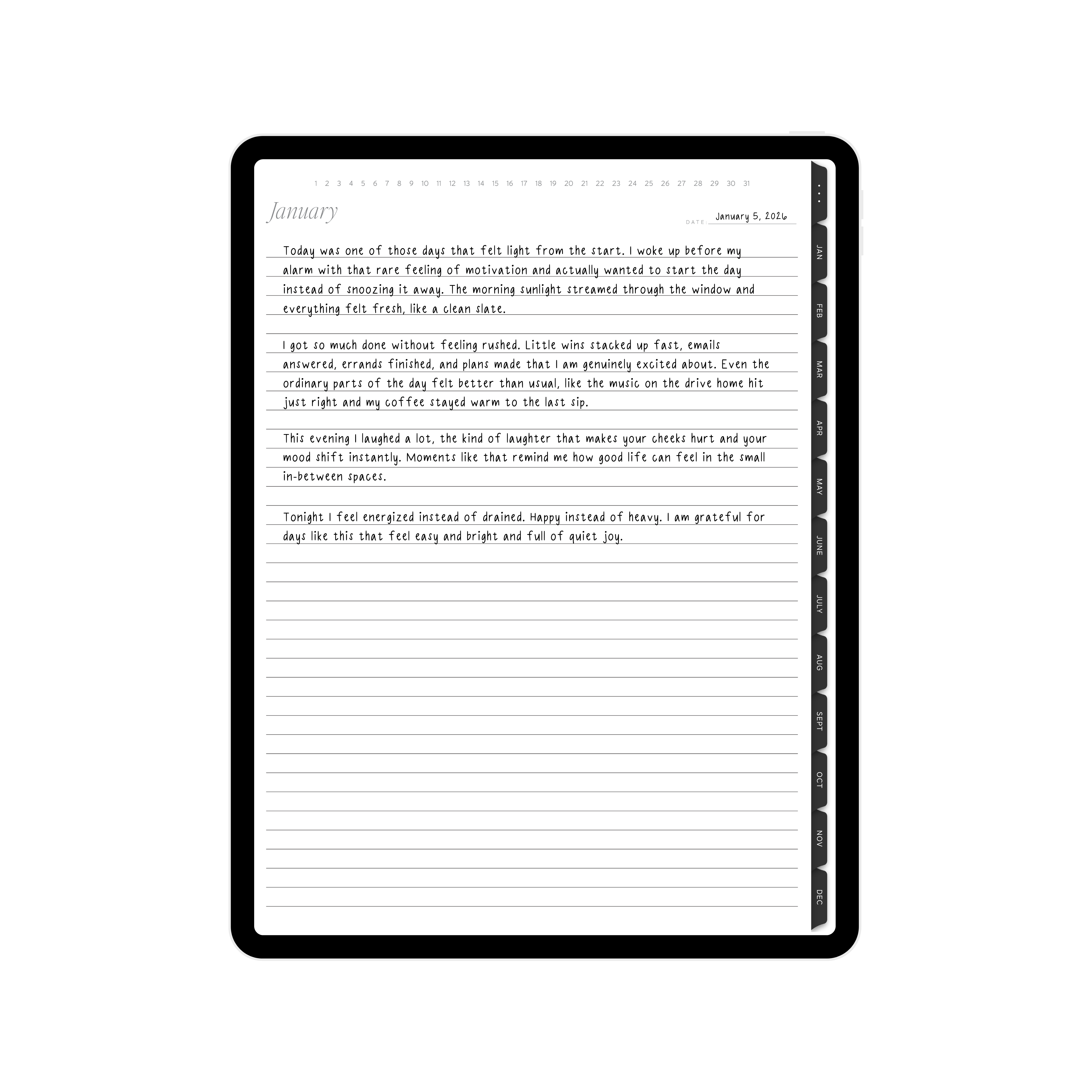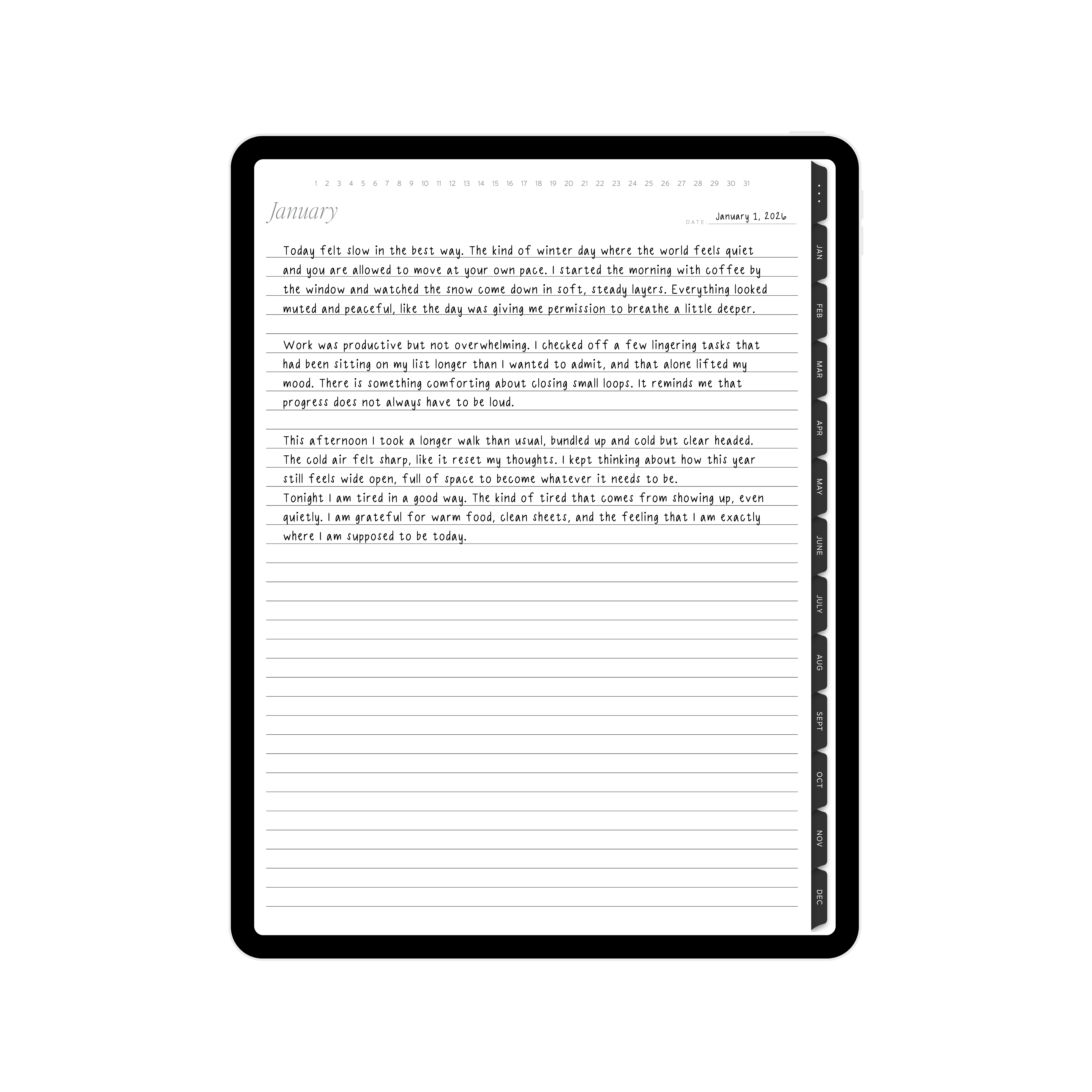 What is the Digital Journal? The Digital Journal is the iPad version of our paper journal, thoughtfully designed to be used in Goodnotes. It offers a clean, open space for writing, reflecting, and organizing your thoughts digitally.
