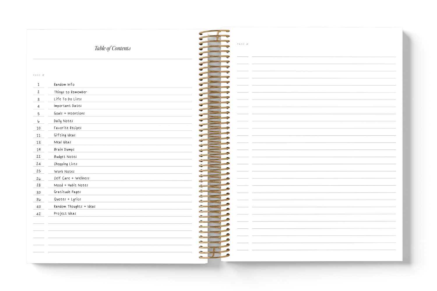 Inside, you’ll find a front page that lets you clearly note the time frame and purpose of your notebook, followed by a table of contents so you can fully organize your thoughts - whether you’re using it for class notes, work projects, or a running to-do list.
